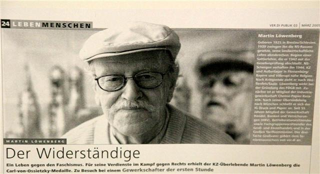 - Martin Löwenberg (München) hat Konzentrationslager und Zwangsarbeit überlebt. Er gehört zu den Gründungsmitgliedern der VVN. Aus politischen Gründen wurde er in der jungen Bundesrepublik verfolgt und verhaftet - wegen seines sozialistischen und antifaschistischen Engagements in einer Organisation, die vom Staatsschutz im Kalten Krieg als "Tarnorganisation" der verbotenen KPD eingestuft worden war. Zweimal stand er vor Gericht, zweimal wurde er zu jeweils 10 Monaten Haft verurteilt - allein wegen seiner gewaltlosen, linksoppositionellen Betätigung und Gesinnung. Im Jahre 2003 stand er wieder vor Gericht: Diesmal wurde er zu einer Geldstrafe verurteilt, weil er dazu aufgerufen hatte, sich in München einem Aufmarsch von Alt- und Neonazis in den Weg zu stellen. Erst kürzlich ist seine Berufung verworfen worden, so dass der heute 79jährige für sein antifaschistisches Engagement rechtskräftig verurteilt ist. Die "Süddeutsche Zeitung" titelte: "Ex-KZ-Häftling wegen Nazi-Protest verurteilt".