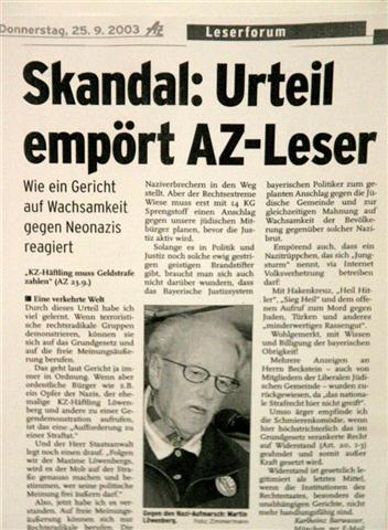 Mit Rufen wie "Nicht in meinem Namen" protestierten die antifaschistischen Zuschauer gegen dieses Urteil. Mehrere, darunter auch der Fraktionschef der Münchner Grünen, Siegfried Benker, wurden daraufhin vom Richter des Saales verwiesen. Am 6. Oktober steht Stadtrat Benker selber vor Gericht. Auch er hatte im vergangenen Jahr dazu aufgerufen, den Naziaufmarsch zu verhindern.